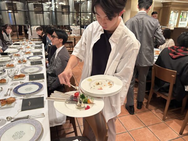 また、「やってみたい!」という学生の声から、前菜のプレートとカトラリーを下げるサービスにも挑戦。
