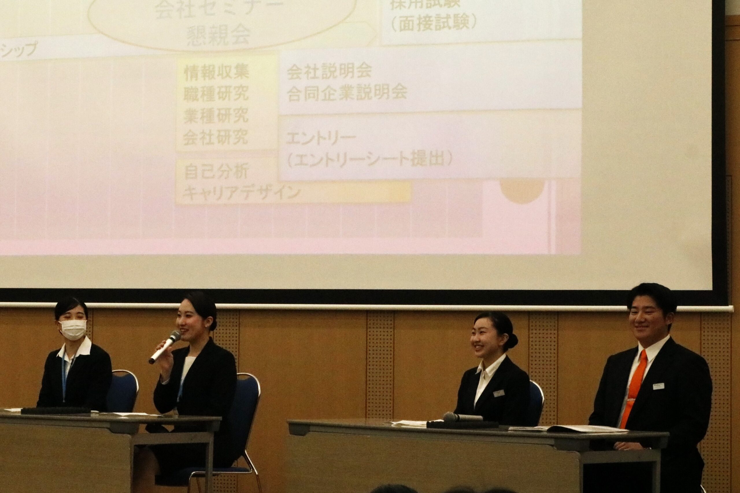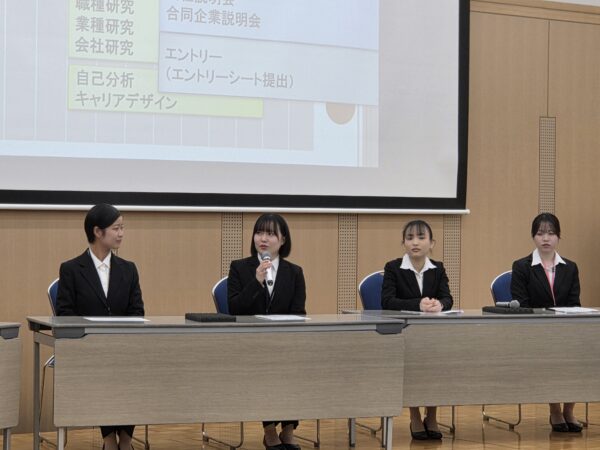 当日は、外部講師の方による講演や、就職内定を勝ち取った先輩の体験談、本番を想定した模擬面接などに取り組みました。 学生たちは緊張感を持ちながらも、真剣な姿勢で参加していました。