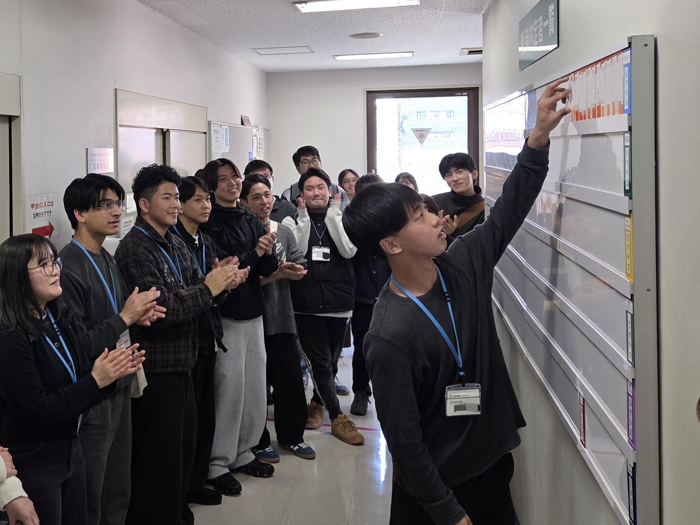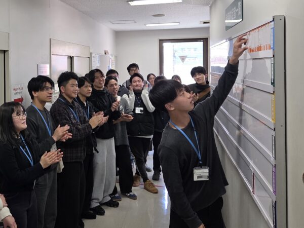 本校では、内定が決まると「プレート上げ」で自分の名前を掲示します 各科複数の学生たちが、春休み中にそれぞれ内定を勝ち取り、新学期早々、伝統のプレート上げを行いました。